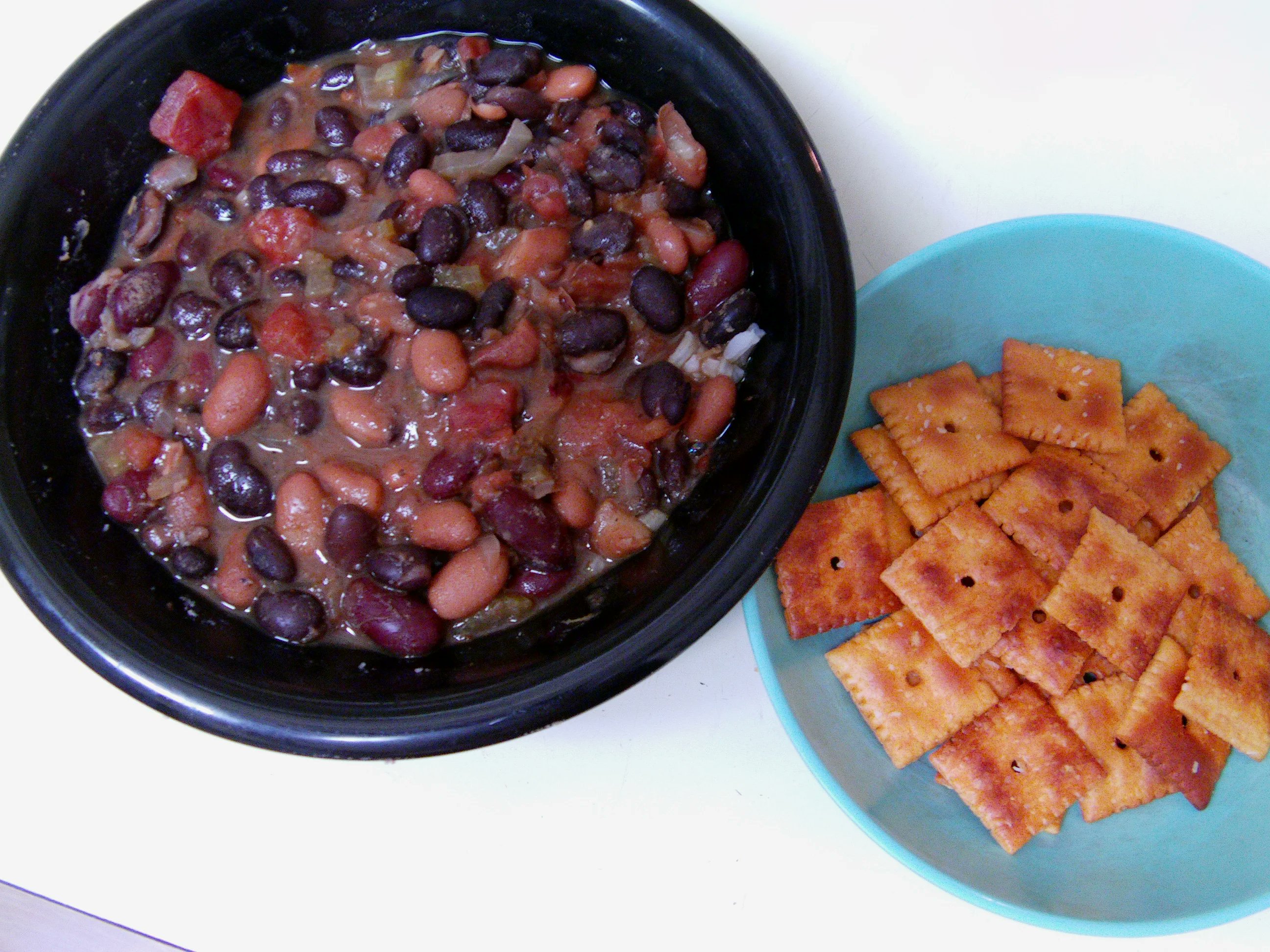 I drain and rinse the red and black beans and use the full pinto beans as a thickener.