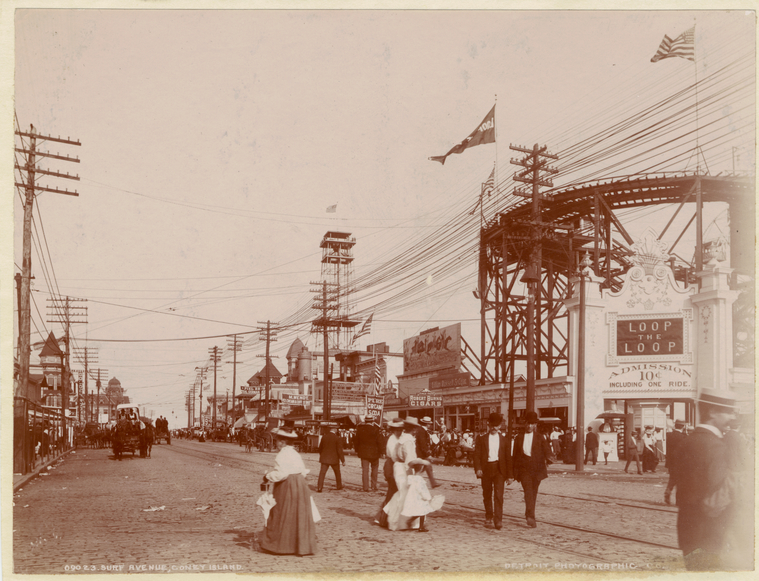 1901-05. "Loop the loop" "Admission 10¢ including one ride" "James Fazio Robert Burns Cigars" "Lillian Russe'' 5¢ cigar" "Pure cream soda" "M Wendt ice cream & coffee saloon"--signs in image.