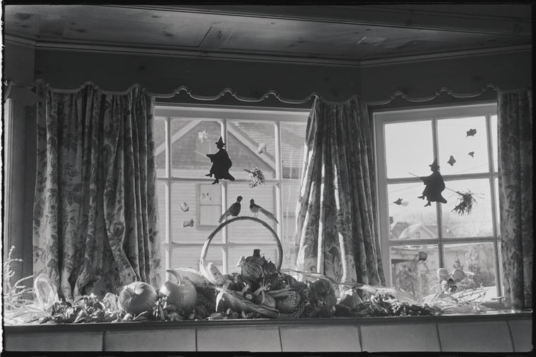 1936-40. Poster for the WPA Statewide Library Project, showing a boy reading a book, surrounded by a bat, ghost, witch, and other images of Halloween.